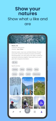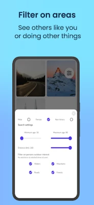 - Filter by Interest: Tailor your matches based on preferences like Forest, Mountain, Road, or Water activities.