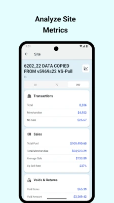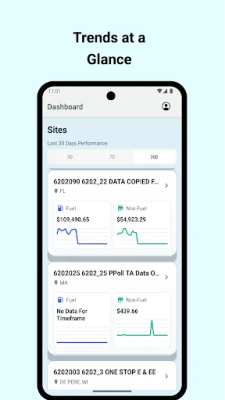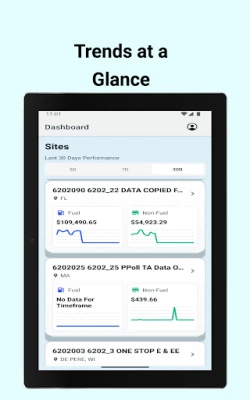 Quickly scan a scrollable list of site cards showing each location’s register sales and fuel volumes/dollars.